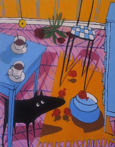 woorden om beelden Woorden om beelden Hoewel ik eigenlijk vind dat mijn werk voor zichzelf spreekt en ik het niet noodzakelijk acht dat de toeschouwer mijn perspectief deelt, wil ik toch enige woorden wijden aan de beelden die ik met penseel of bijl oproep. Mijn schilderijen en beelden ontstaan altijd vanuit mijn kijk op de wereld. En hoewel deze kijk donkerder wordt, naarmate ik dieper in mijn ziel (of is het mijn navel?) kijk, blijven mijn werken, op het eerste gezicht, vrolijke en aangenaam verteerbare verbeeldingen. De wereld is een tranendal, daar zijn we het allemaal over eens en dat hoeven we dus ook niet meer van de daken te schreeuwen. Maar om de kommer en kwel helemaal te negeren lijkt me ook niet echt heilzaam. In mijn wereldbeeld zijn mensen niet persé slecht, ik zie ons meer als sukkelaars, tussen wal en schip gevallen, niet echt dier maar zeker geen goden. En zo zitten we op ons kleine planeetje dat zich, met een enorme snelheid door een eindeloze leegte stort; we weten niet waar we vandaan komen, we weten niet waar we naartoe gaan. Letterlijk 'Lost in space'. Maar met dit referentiekader kunnen we natuurlijk niets en daarom heeft de mensheid er het volgende op gevonden: hij liegt! Of positiever geformuleerd; hij gebruikt zijn fantasie. De mens verzint verhalen waar hij dan vervolgens zelf in gaat geloven en wanneer veel mensen dezelfde leugens volgen; dan hebben we een godsdienst of zelfs een hele cultuur. De zaak is wel om hardnekkig te blijven geloven in al de leugens want anders stort onze wereld in en rest ons de grote leegte. Ik zie al deze leugens aan, ik herken ze als leugens, en verkies het toch om in mijn leugens verder te leven; het is goed zo. Maar het is ook goed te beseffen dat wij in leugen leven en dat we zelf onze leugen, naar eigen behoefte kunnen kiezen. Daar gaat mijn werk over. De vrolijke interieurtjes zitten als het ware, met leugentjes aan elkaar geschilderd. En als je ze wil zien, zie je ze; de schaduwen en perspectief kloppen nooit. De meubels zijn niet echt gebruiksvriendelijk, en al het leven is ontworteld; de hond, van oorsprong wolf, is zo gecultiveerd, dat hij slechts kan wachten op de mens (die in de schilderijen nooit komt opdagen) zodat hij z`n koekje mag ontvangen. De goudvis in zijn veel te kleine aquarium, zijn kleine veilige wereldje zonder enig avontuur. Zelf wanneer de vis het aquarium verlaat kan hij niet anders dan als een mot om een lamp cirkelen in doelloosheid. Bloemen zijn altijd ontworteld en wachten een langzame dood. Tenslotte staat het eeuwige kopje koffie weer koud te worden. De mens (gast?) laat immer op zich wachten. En toch zijn de schilderijen vrolijk en optimistisch ... hoe kan dat toch? Voor mij is het een bewijs dat de leugens werken. Ik raad dan ook een ieder aan om te volharden in de leugen, maar kijk uit welke leugens je kiest; want de juiste leugen maakt het leven zoet, de foute leugens daarentegen ...